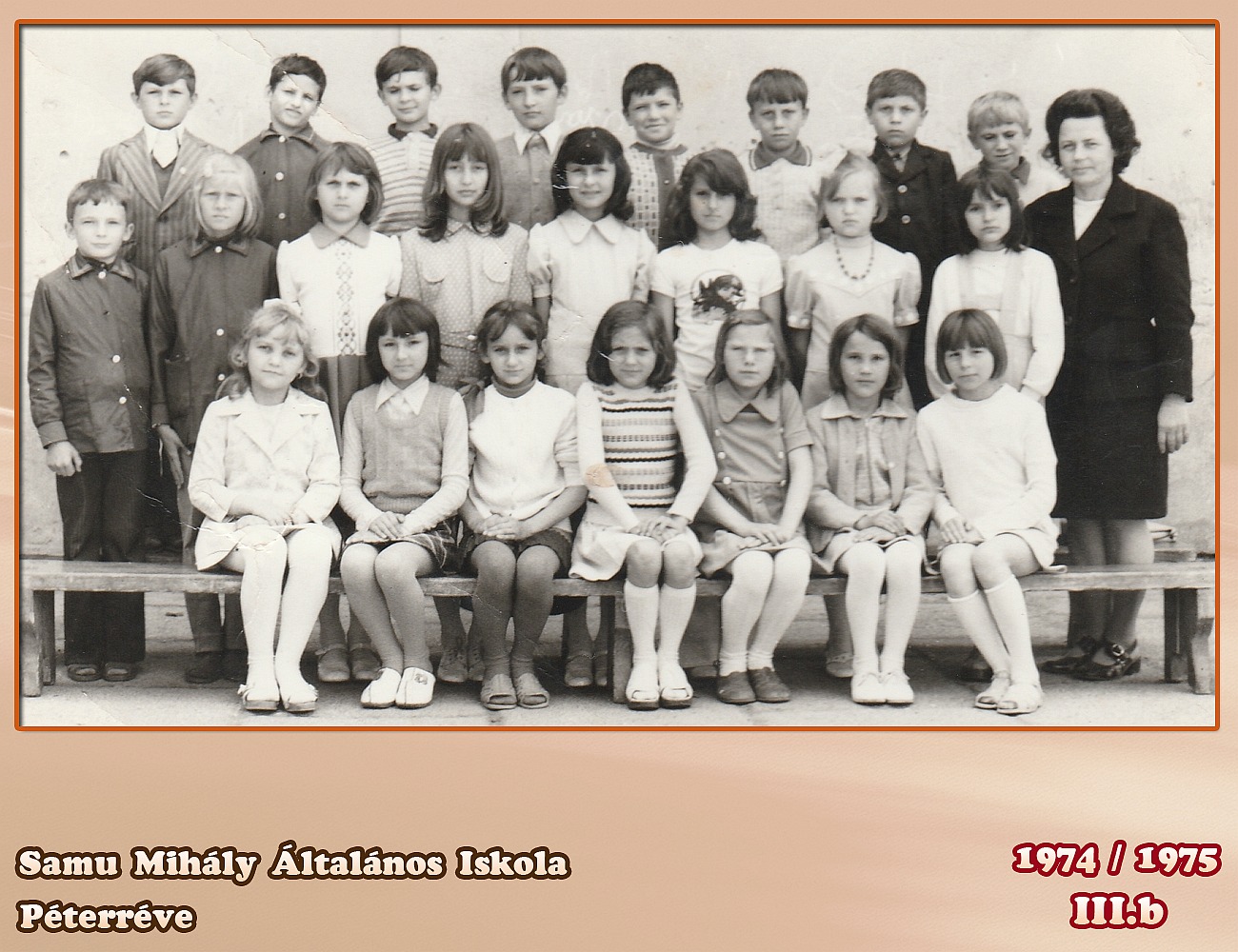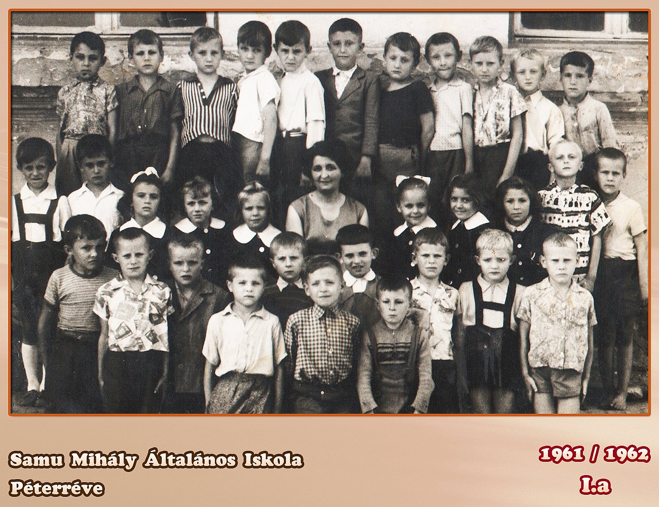 Tanító néni Kaposi Izabella mellette jobról Gulyás Katalin guggol jobrol Sívó Ilonka tanító néni mögött Szekeres Tibor a bátyám balról a felső sorban az ötödik Márkus István felső sorban a kilencedik Csajkás László felső sor jobról az első a Párduc Dezső nem biztos tanító néni előtt gugol még Tokodi nem tudom a nevét a Csajkás mögött Mester István.