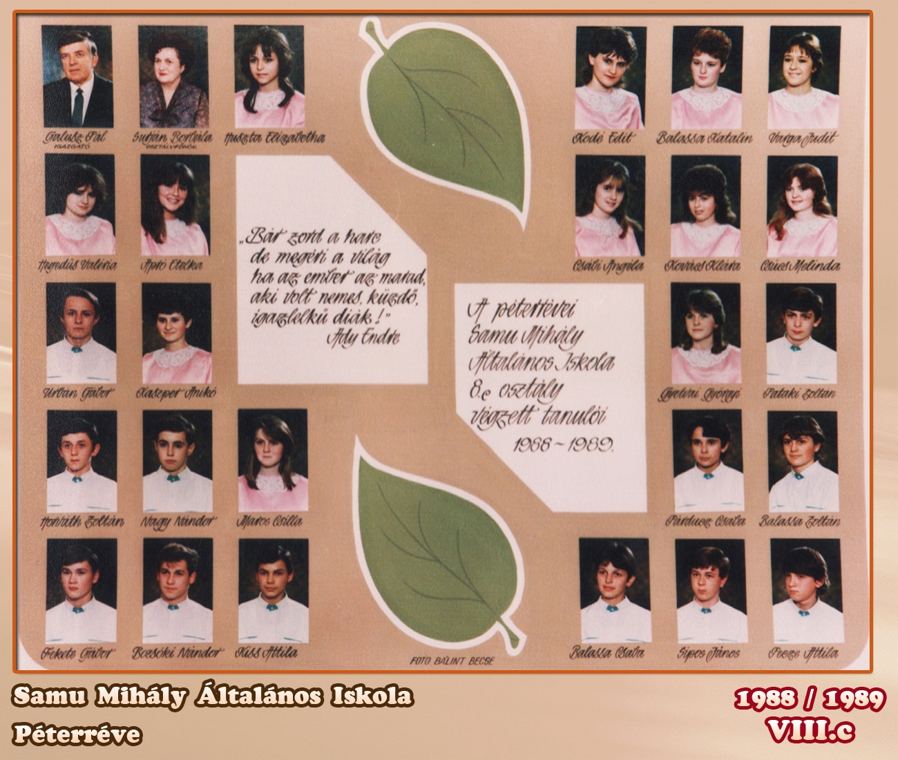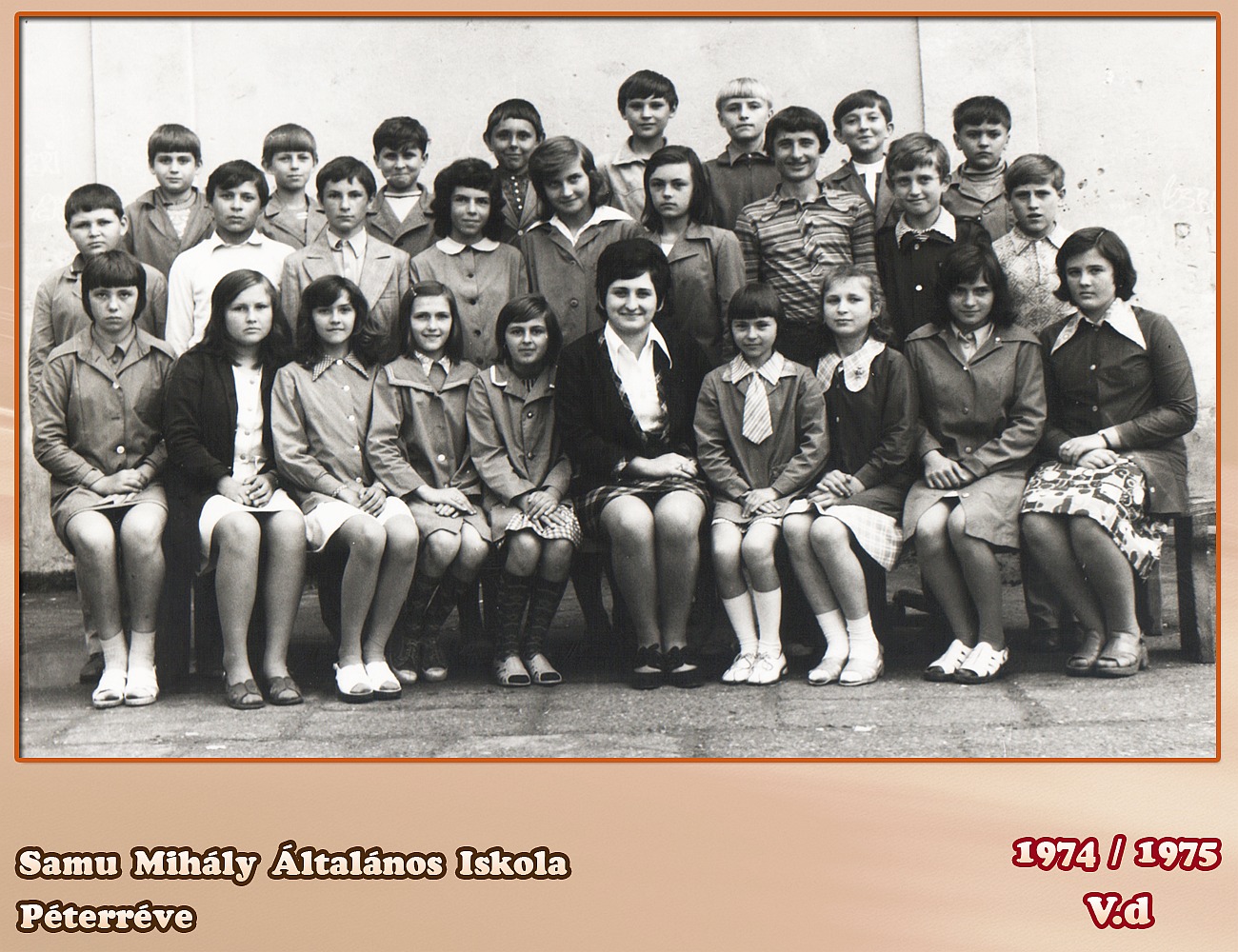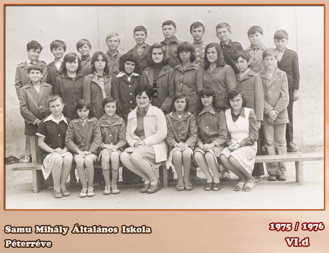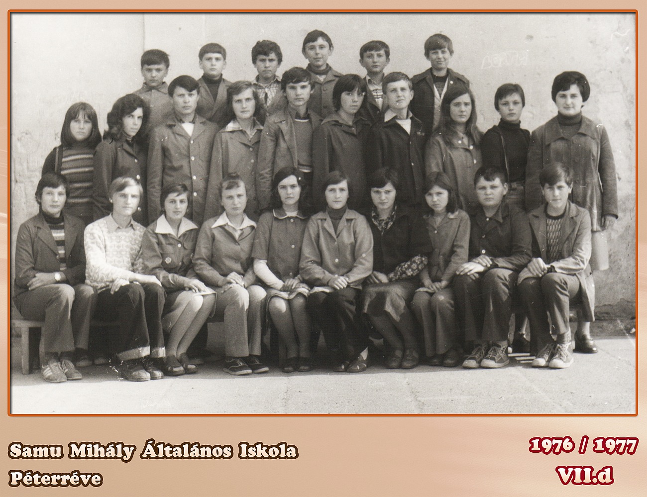 Beugrott. Leghátsó sor: Horváth Tibor, Szabó Tibor, Horváth Dezső, Micsíz Illés, Sánta József, Nagy Zoltán, Tripolszky Ferenc, Horváth Gáspár Középső sor: Szalma József (+), Varga Sándor, ??, Halápi Katalin, Balassa Piroska, Tóth Éva, Dzsoity Illés, Kiss Lajos, Kreszánkó József Ülnek: Kamaszi Aranka, Papp Ida, Basa Zsuzsanna, Borsos Rózsa, Börcsök Aranka, Márkus Gizella (osztályfőnök), Rácz Gizella, Varga Ilona, Halápi Terézia, Sinkovics Ibolya Már csak egy név hiányzik!