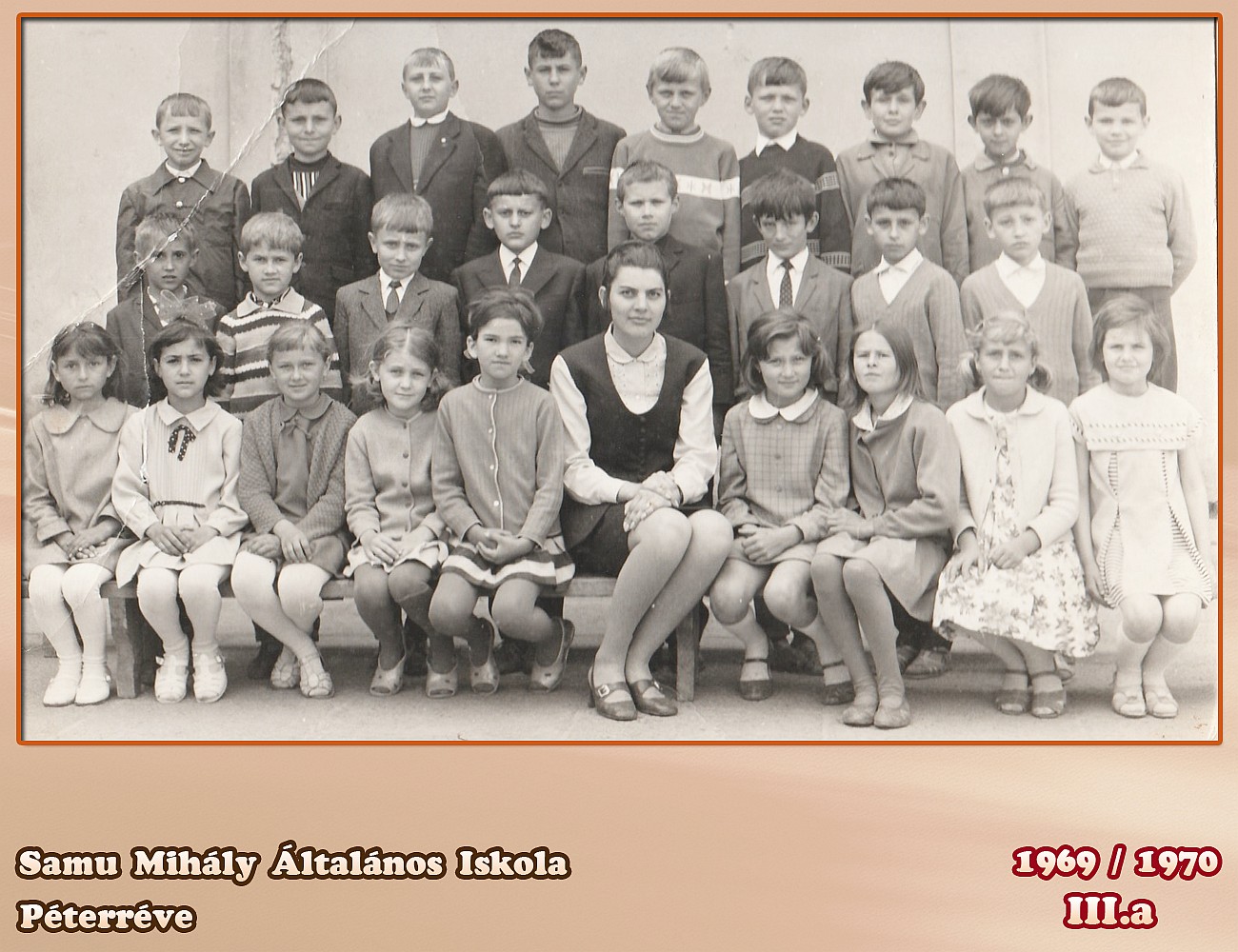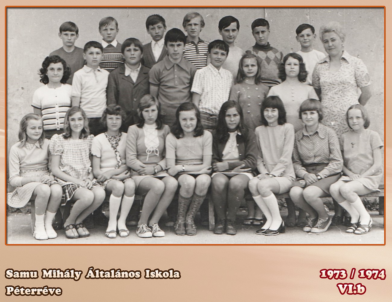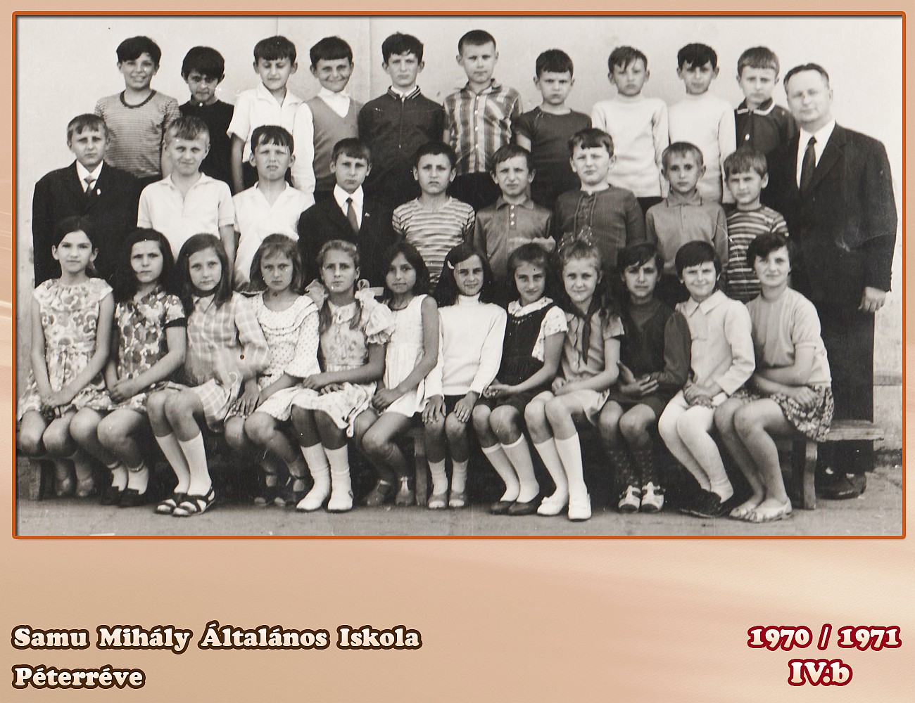 Akiket felismerek, hiszen párhuzamos osztály voltunk a "KISISKOLÁBAN": Felső sor Molnár Sándor (D), Kuti Gyusz (H), lehet hogy Kasza de nem biztos, ha igen akkor Kanadába költöztek, .... ... Sanyi, savóhegyről, Medve Mihály, Péter Imre (+), Dávid Gábor (H), Szabó Károly, (Bácsföldvár), .... .. ...., Középső sor Vajda Zoltán, Huttyai Ferenc, Kiss Gábor, Detki László, Tóth Lajos, Halápi Ferenc, Öreg Imre és Öreg Zoltán Ülnek: Barna Kati, Tubik Klári, Jablanszki Vali, Gallusz Ildi, Kiss Gizi, az osztályfőnök, Balassa Cili, .......... .....,,,,.. , Hegedűs Ilona és .............